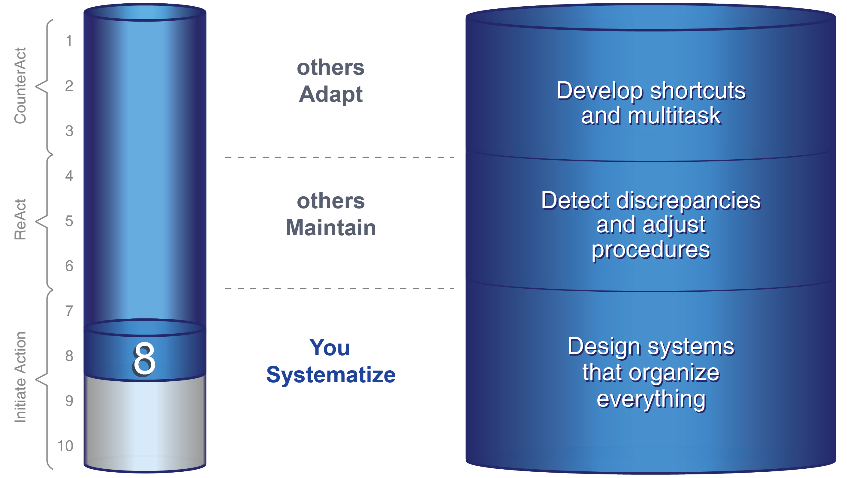 Don’t let anyone stereotype you as contributing or “being” just one of the Action Modes. Your contribution begins with systematizing and continues until you stabilize the solution.